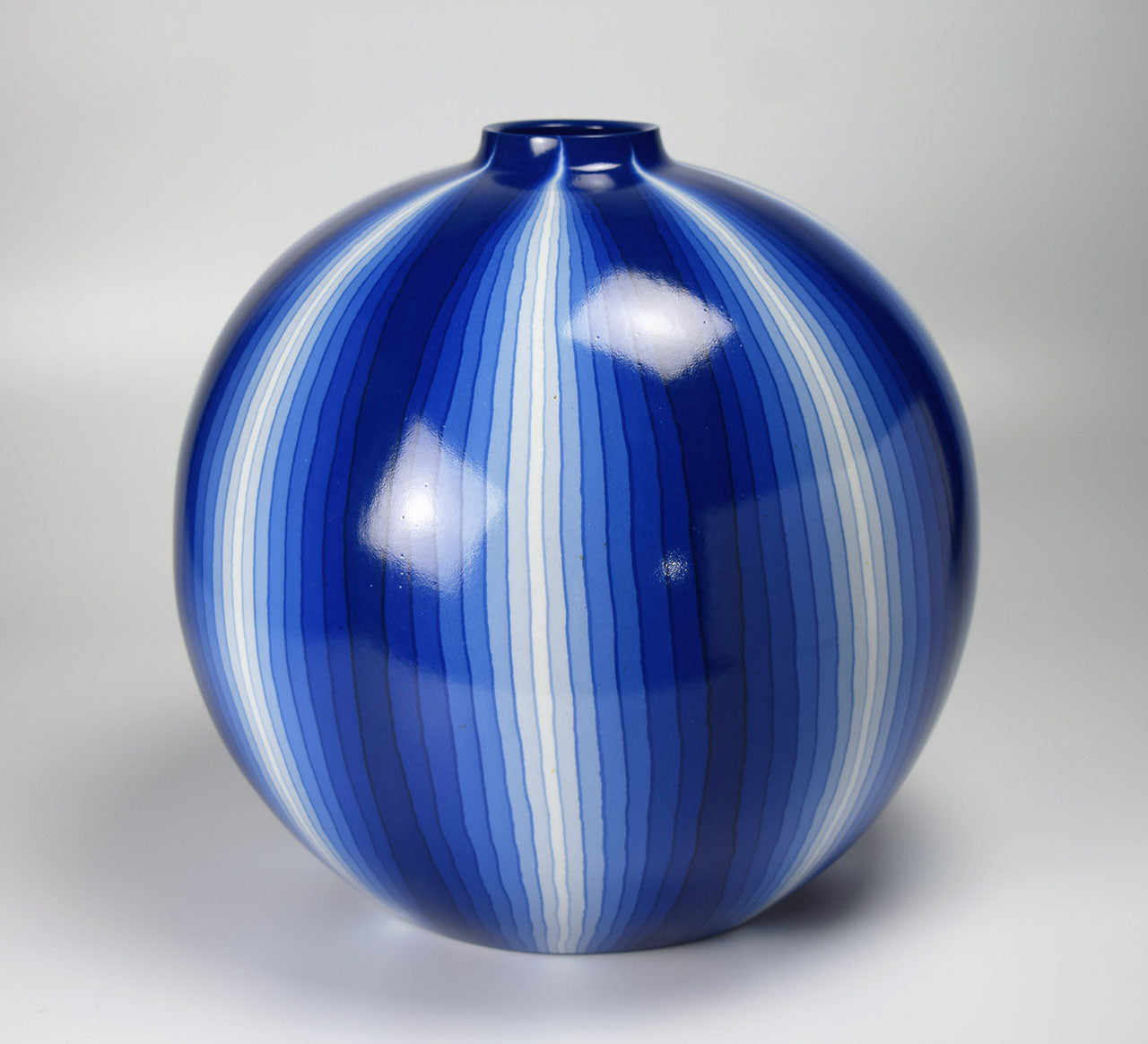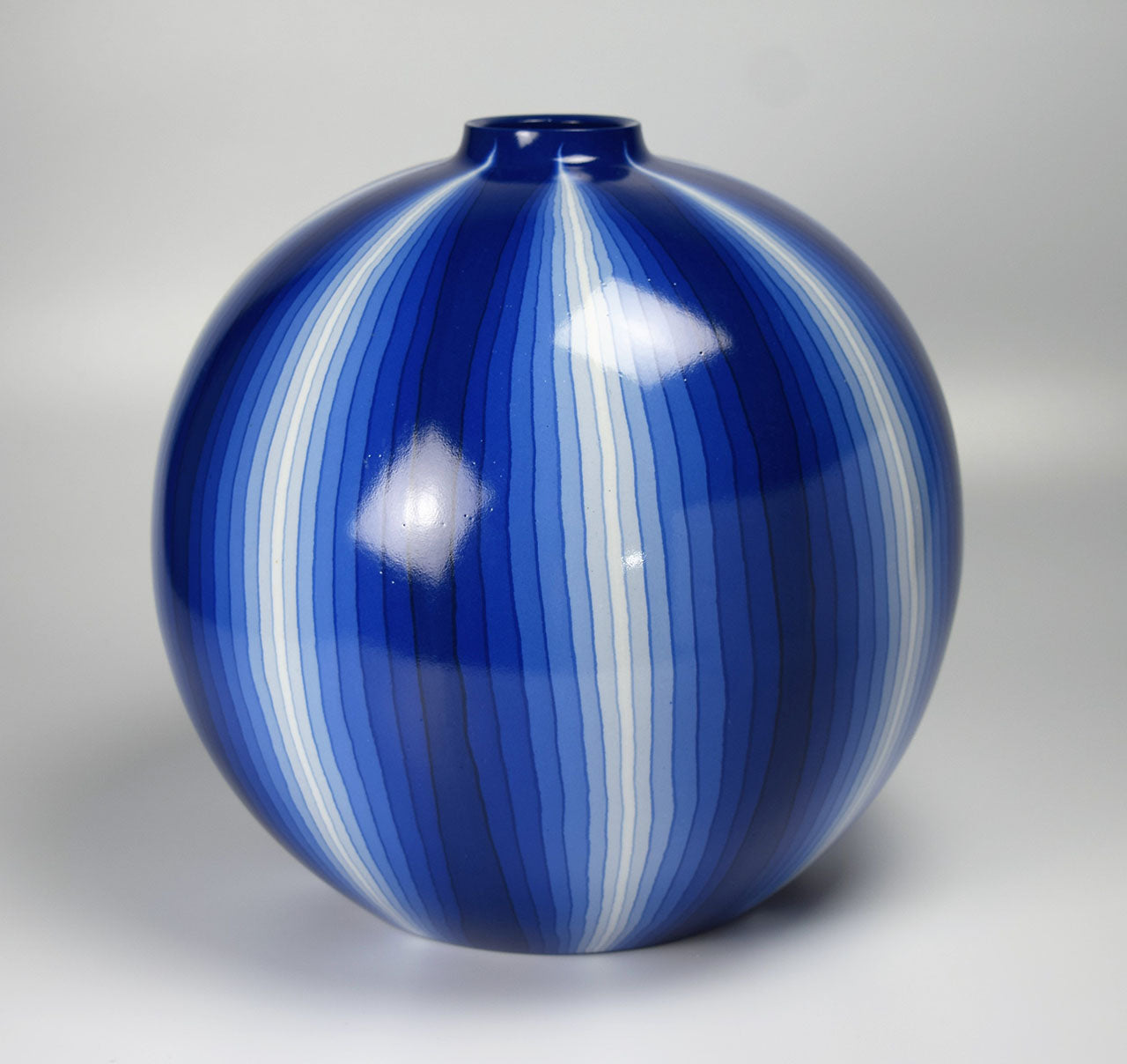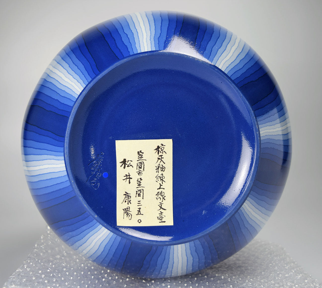 Flower vessel, Pot, Muku ash glazed, Kneading technique, Line design, Ultramarine - Koyo Matsui, Kasama ware, Ceramics