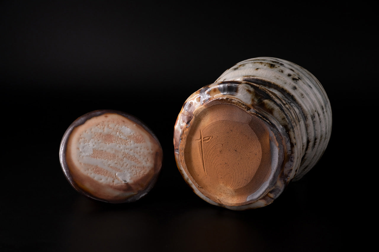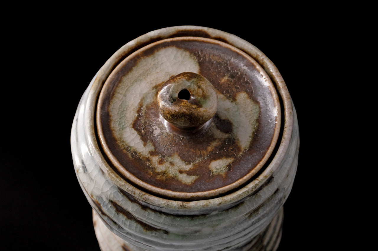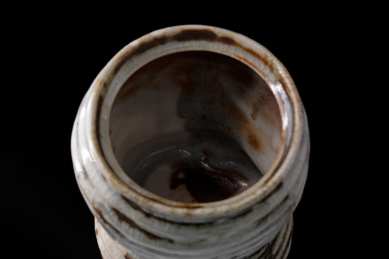 This is a Nezumi shino water jug. It looks like an upside-down gourd, with a large top and a small bottom. The unique mogusa clay of Mino ware is generously covered with feldspar glaze. When the clay is half-dried, a wooden spatula is used to scrape off the excess clay. In this process, the clay is scraped off to the very limit of the thickness of the work. Through this way, the vessel is finished to be light and easy to handle while having a stately appearance. By applying oniita mud underneath the glaze, a gradation of white and gray is created along with the shading of the glaze, and the burnt iron that appears in some areas becomes an accent in the scenery. The works are slowly fired in an old-style wood-fired kiln over a period of one week, and you can enjoy the varied expressions of each piece.