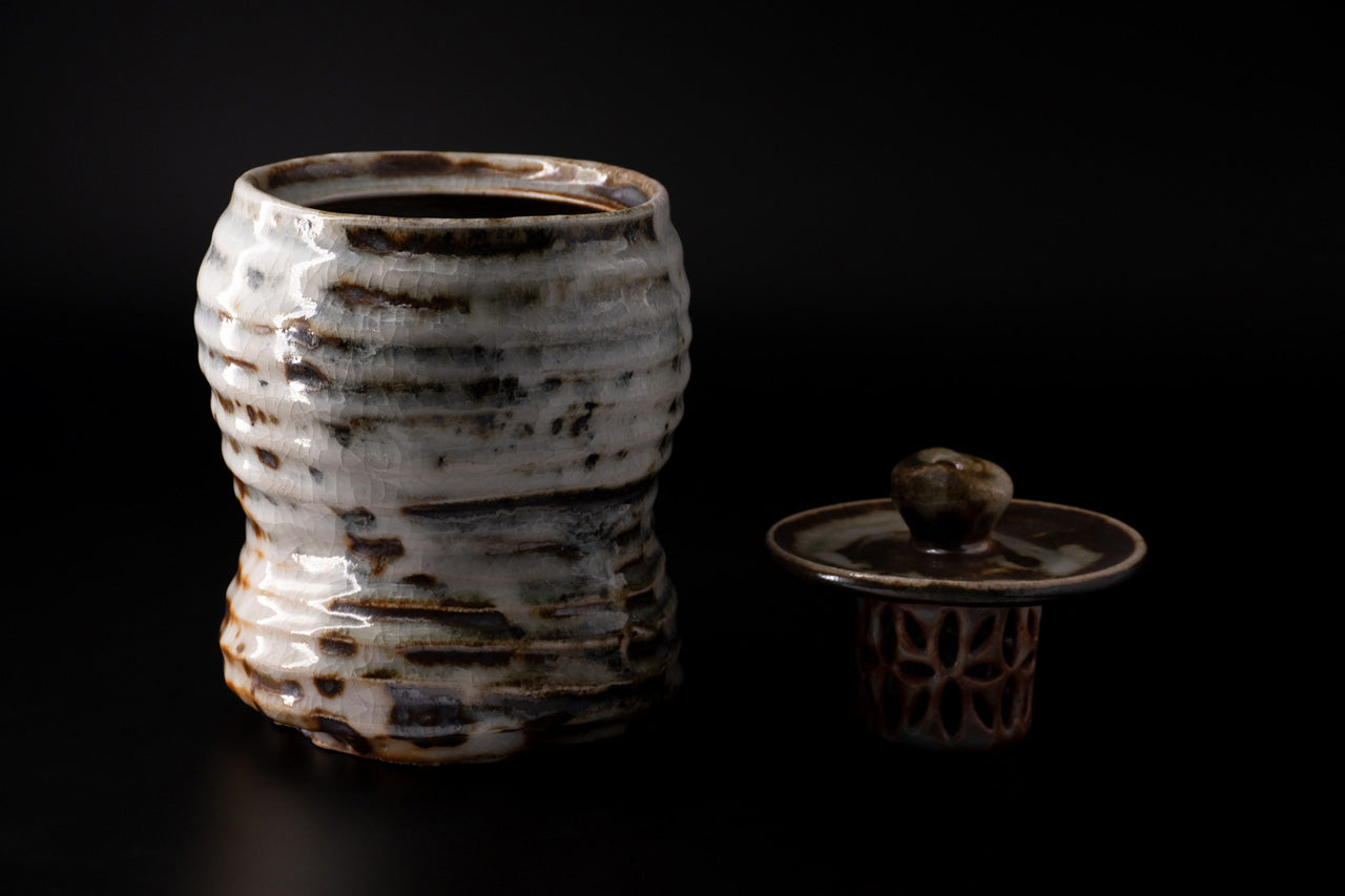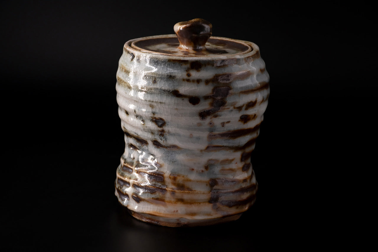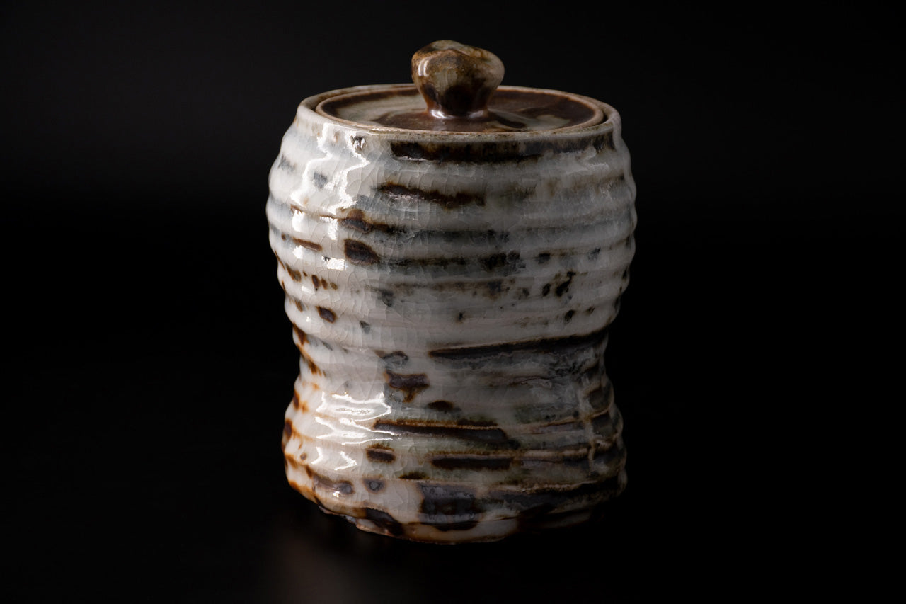 This is a Nezumi shino water jug. It looks like an upside-down gourd, with a large top and a small bottom. The unique mogusa clay of Mino ware is generously covered with feldspar glaze. When the clay is half-dried, a wooden spatula is used to scrape off the excess clay. In this process, the clay is scraped off to the very limit of the thickness of the work. Through this way, the vessel is finished to be light and easy to handle while having a stately appearance. By applying oniita mud underneath the glaze, a gradation of white and gray is created along with the shading of the glaze, and the burnt iron that appears in some areas becomes an accent in the scenery. The works are slowly fired in an old-style wood-fired kiln over a period of one week, and you can enjoy the varied expressions of each piece.