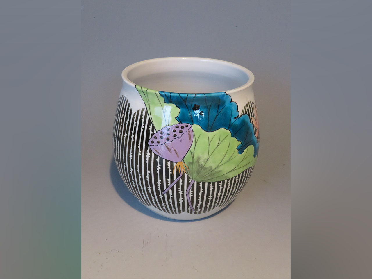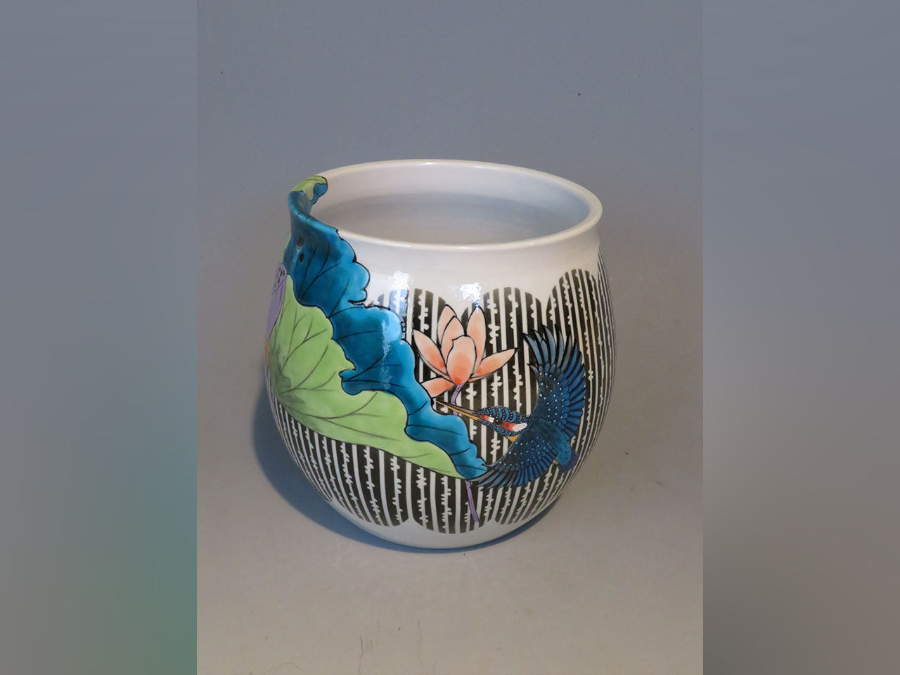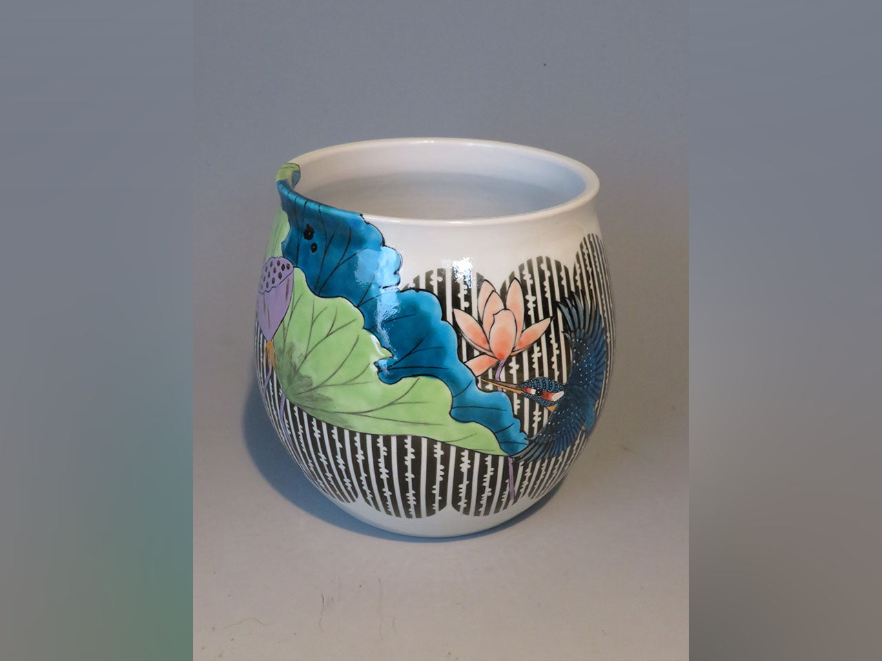 Flower vessel, Fukizumi colored glaze pot, Lotus and Kingfisher, Hand-drawn - Yoshihiro Yamaguchi, Kutani ware, Ceramics
