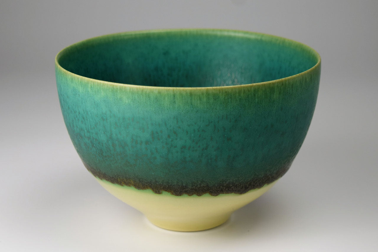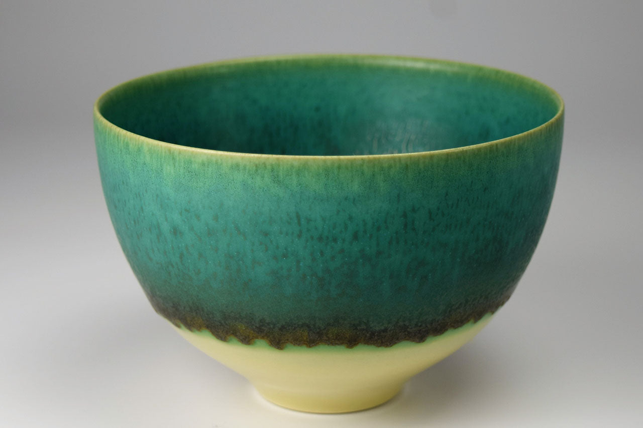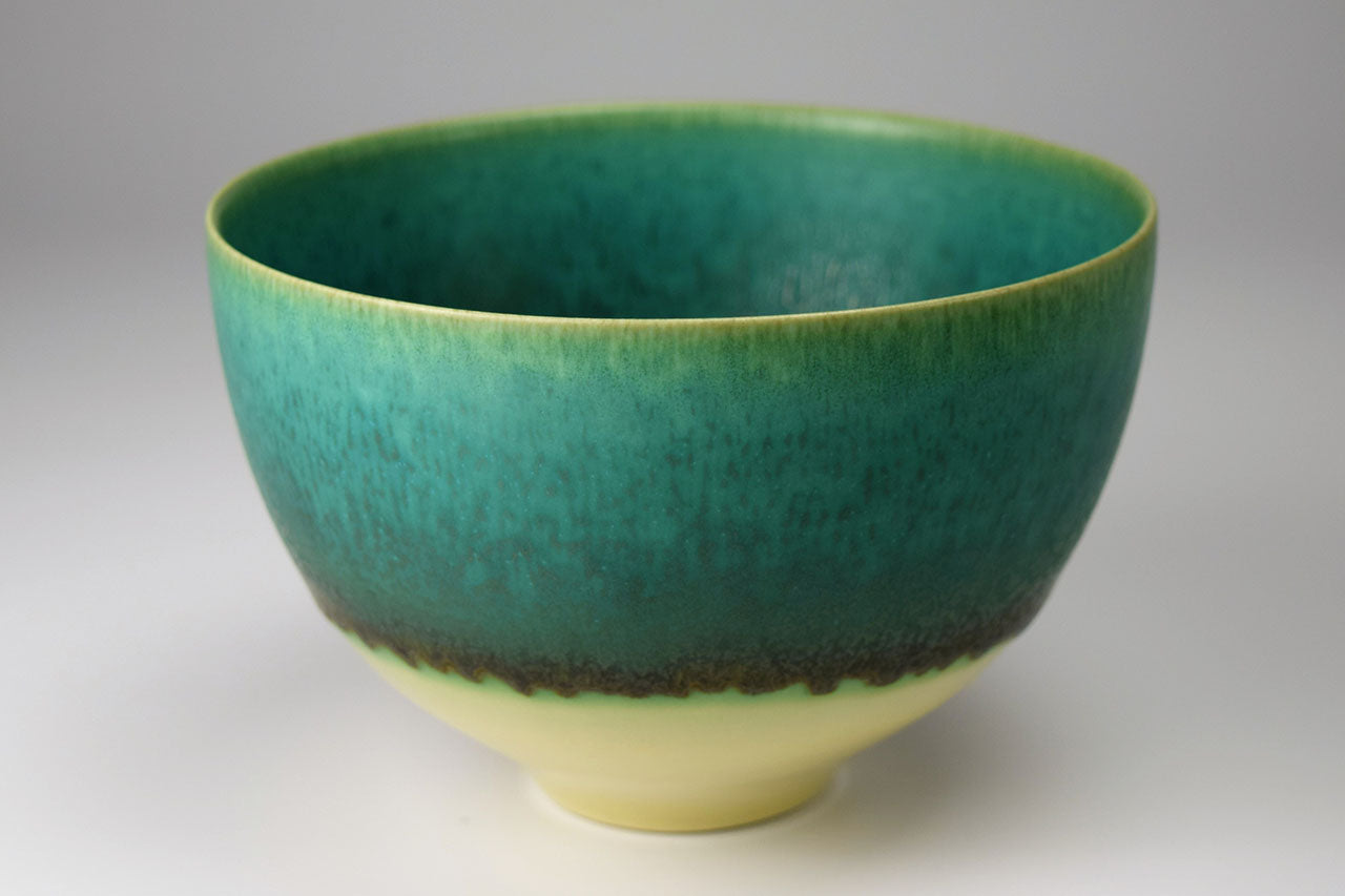 作家の井上英基は、ドイツにてドイツ人陶芸家に師事、釉薬の研究を重ねました。緑色の「碧彩釉」を中心に重ね掛けによって自然なグラデーションを釉薬の流れで表現しています。