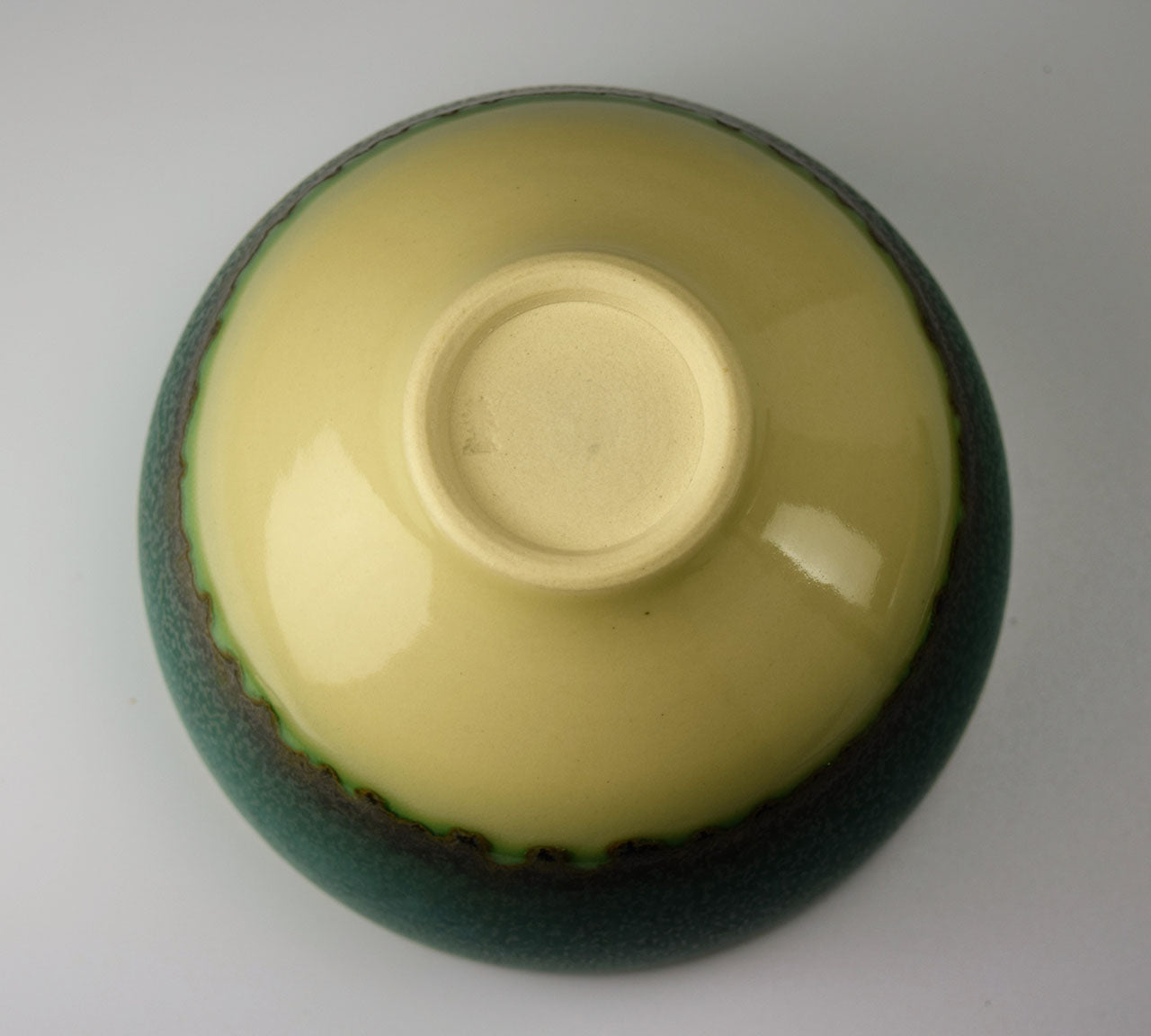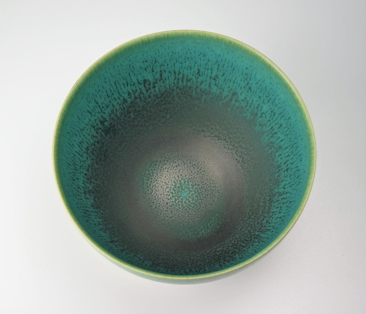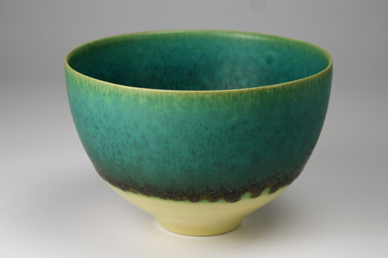 作家の井上英基は、ドイツにてドイツ人陶芸家に師事、釉薬の研究を重ねました。緑色の「碧彩釉」を中心に重ね掛けによって自然なグラデーションを釉薬の流れで表現しています。