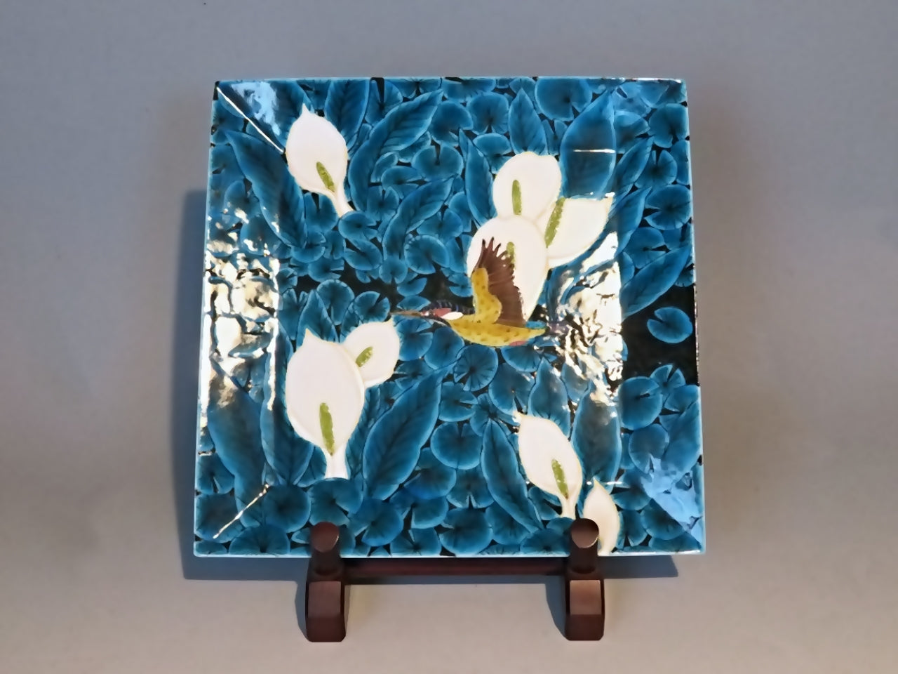 作家独自の美しい青緑を背景に、水辺に咲く可憐で清らかな野花・水芭蕉と、水辺の宝石・翡翠(かわせみ)を描いています。赤を除く絵の具で素地の余白を残さずに色絵をつける「塗り埋め」により、重厚感あふれる作品に仕上がっています。