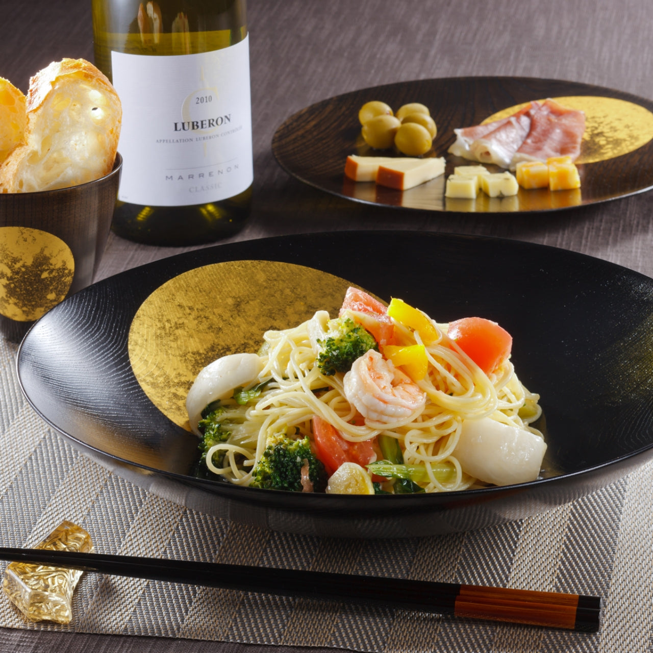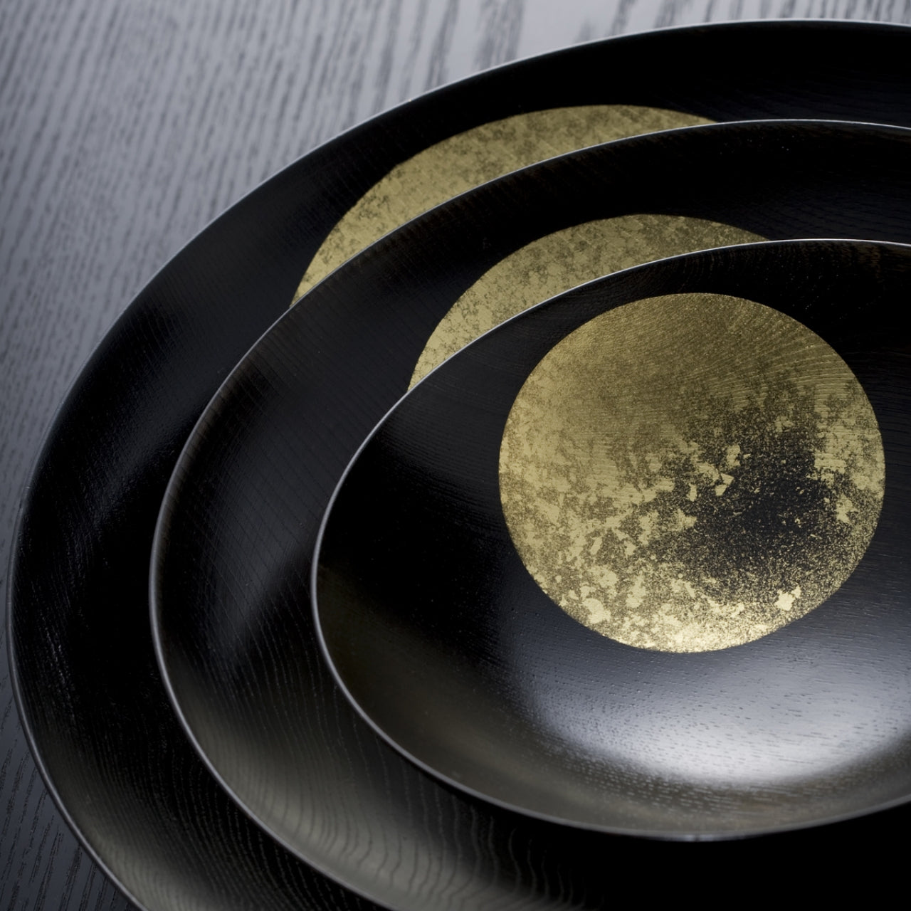 本金箔で表現された「おぼろ月」が、天然木の木目と響き合う木製ボウルです。柔らかな曲線の器に、静かに浮かぶ金の月がアクセントとなり、料理をやさしく引き立てます。
