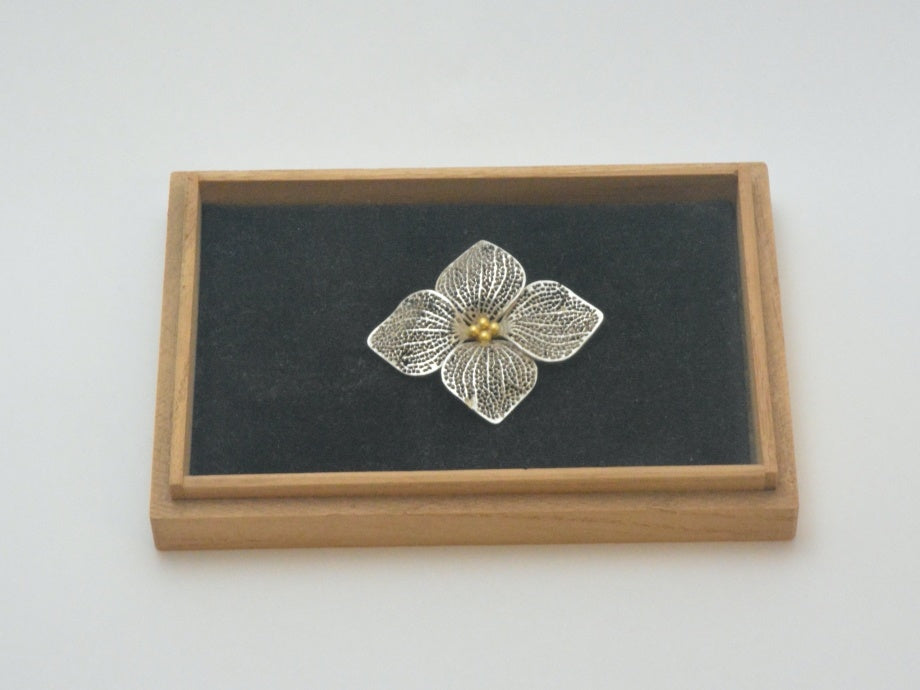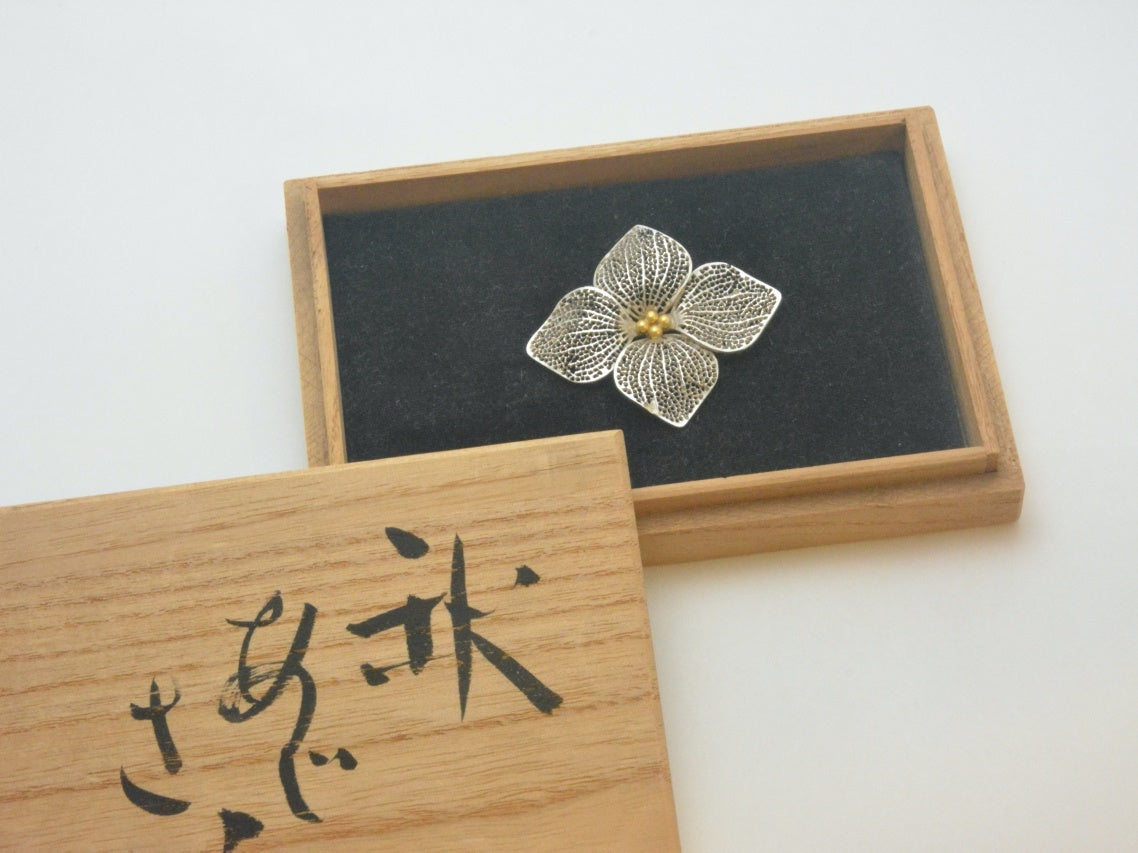 秋の終わりに、葉脈だけを残して姿をとどめるガクアジサイの姿にインスパイアされて製作した作品。板を切り抜き、1枚ずつガクのフォルムを形作り、透かし模様を施したものを接合させて原版を作成。精密鋳造で繊細なデザインを再現しています。真ん中には4つの純金の丸玉を使い、つぼみのような花びらを表現しています。フォーマルやエレガントな装いに似合います。バッグやマフラーにもおススメです。