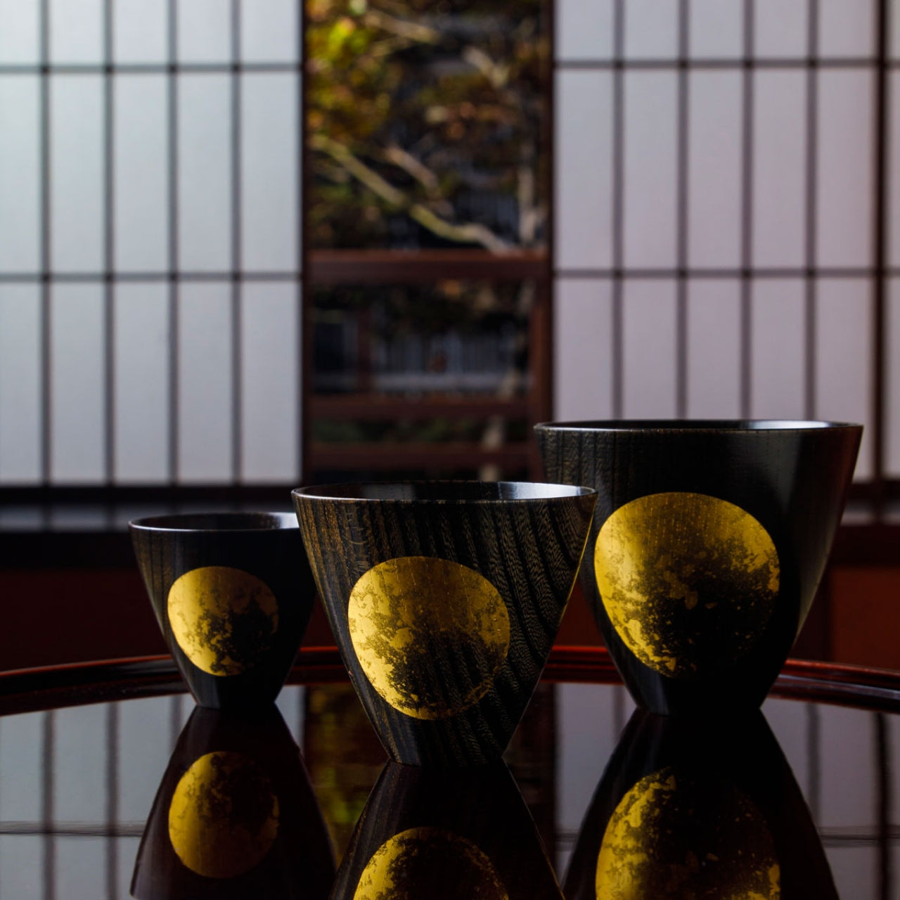 木製のカップは熱が手に伝わりにくく、温かい飲み物にも使いやすいのが特長です。薄く削り出された木地には、熟練の木地師による繊細な技が込められ、木の風合いを引き立てる塗りが施されています。月の部分は、箔貼り職人が金箔のみで空に浮かぶ景色を表現したもの。自然の美しさと職人技がひとつの形となった、現代の暮らしに寄り添う器です。
