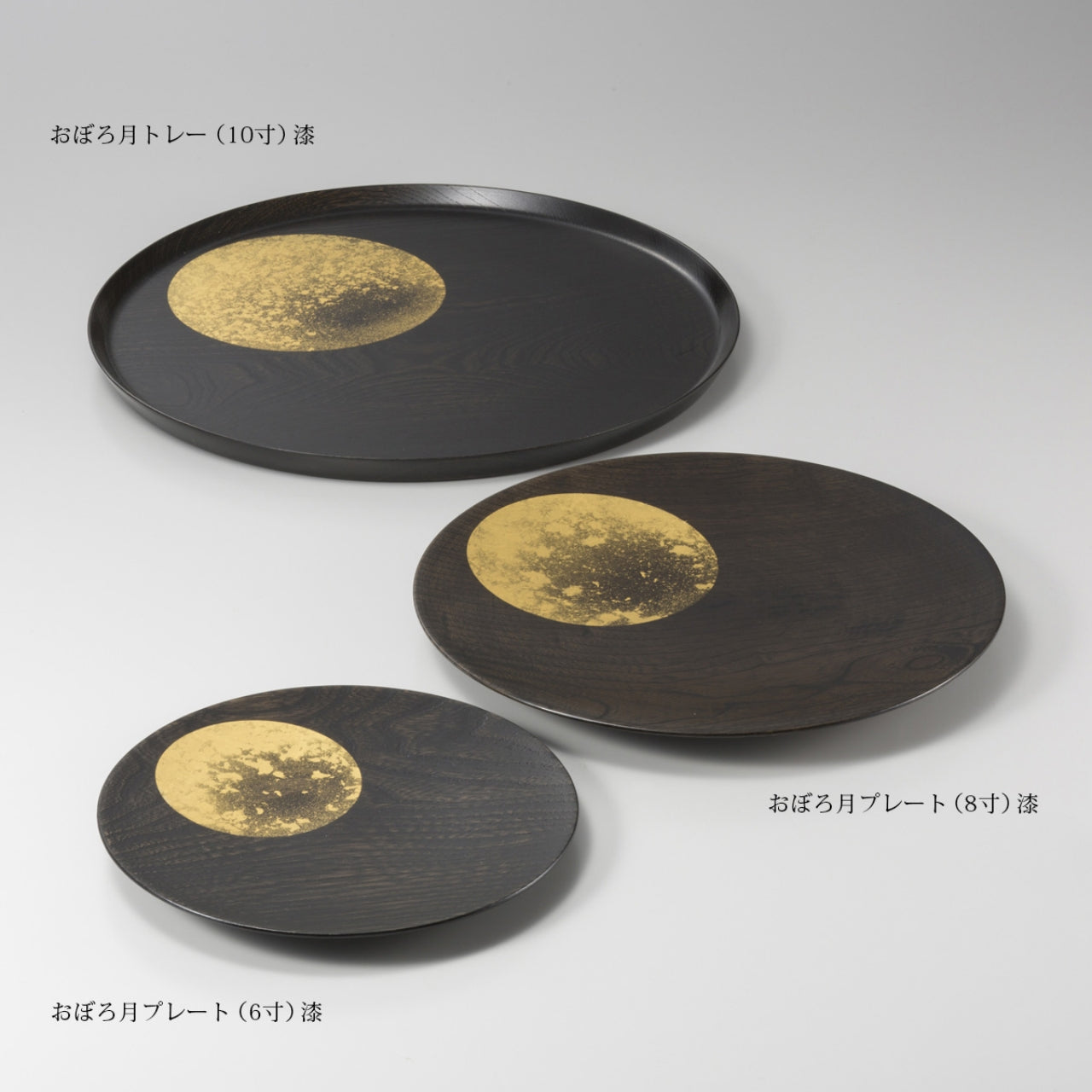 天然木の木目をいかした器に、本金箔で「おぼろ月」を添えたプレートです。黒い木地に浮かぶ金箔の月が、静かな景色のような奥行きを生み、和洋どちらの食卓にも落ち着いた華やぎを与えてくれます。