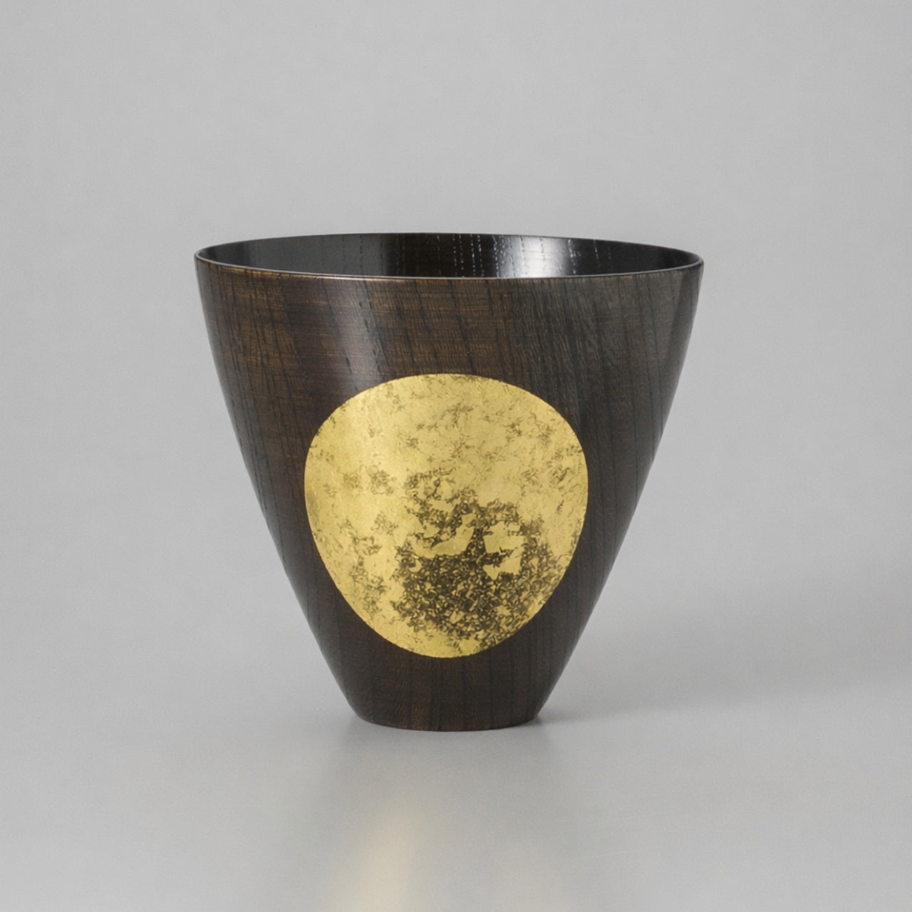 天然木の木目をいかした器に、本金箔で「おぼろ月」を添えたフリーカップです。木地のやわらかな表情と、箔の月がそっと浮かび上がるような意匠が調和し、和洋どちらの食卓にも落ち着いた華やぎをもたらします。