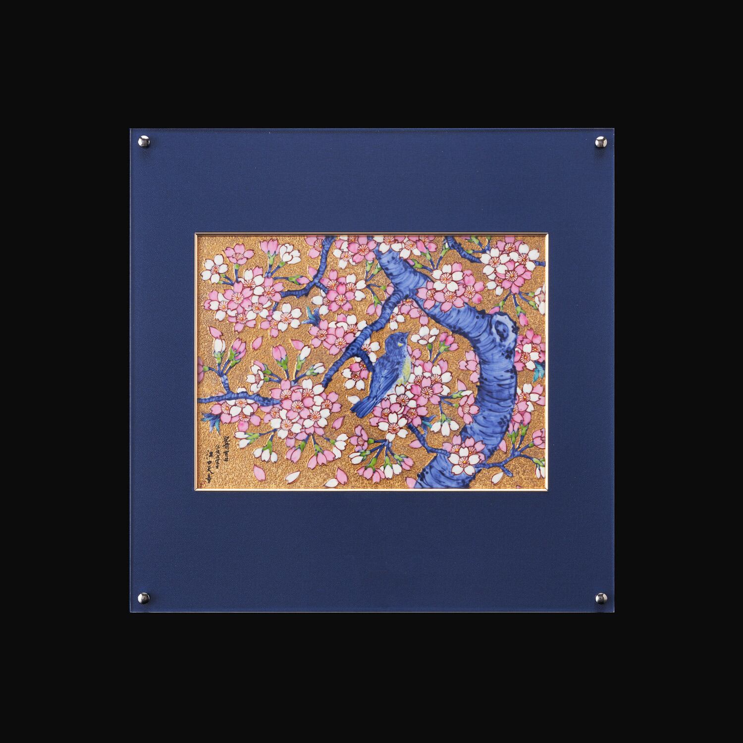 装饰品 迷你陶板画(亚克力框) 金彩樱花鸟图 金龙窑 江口天童 有田烧 陶瓷器
