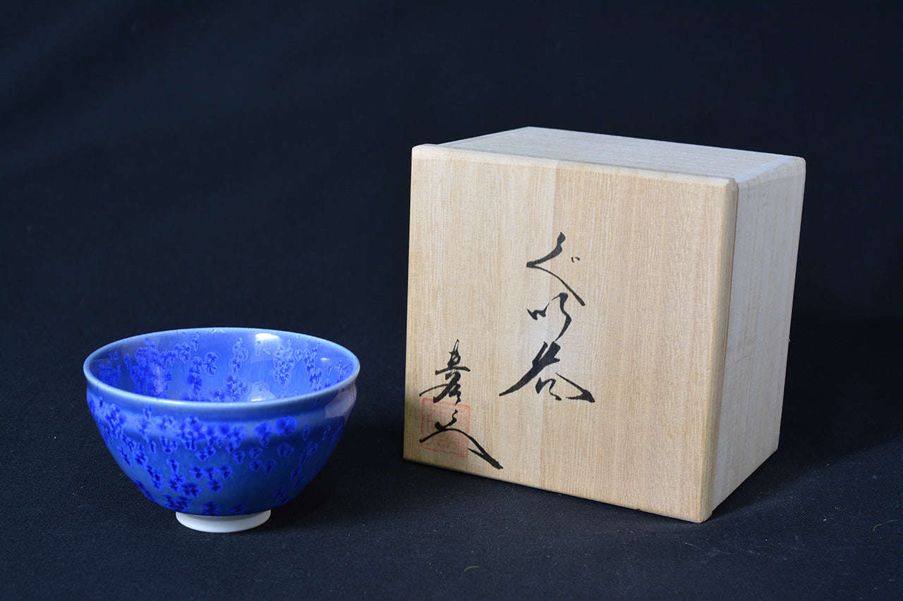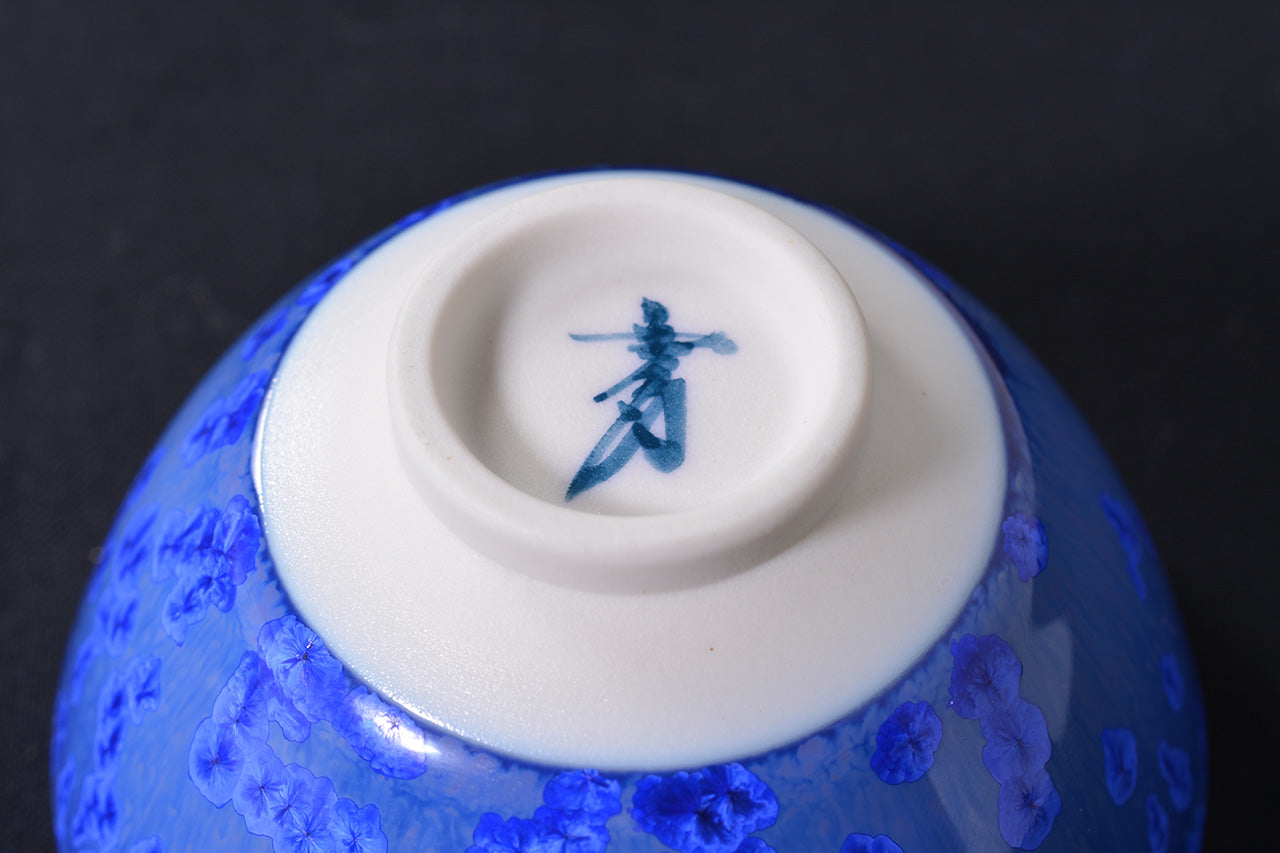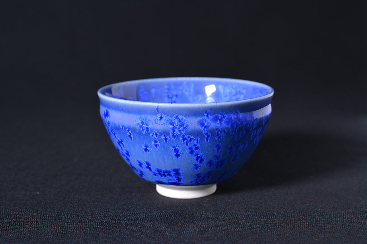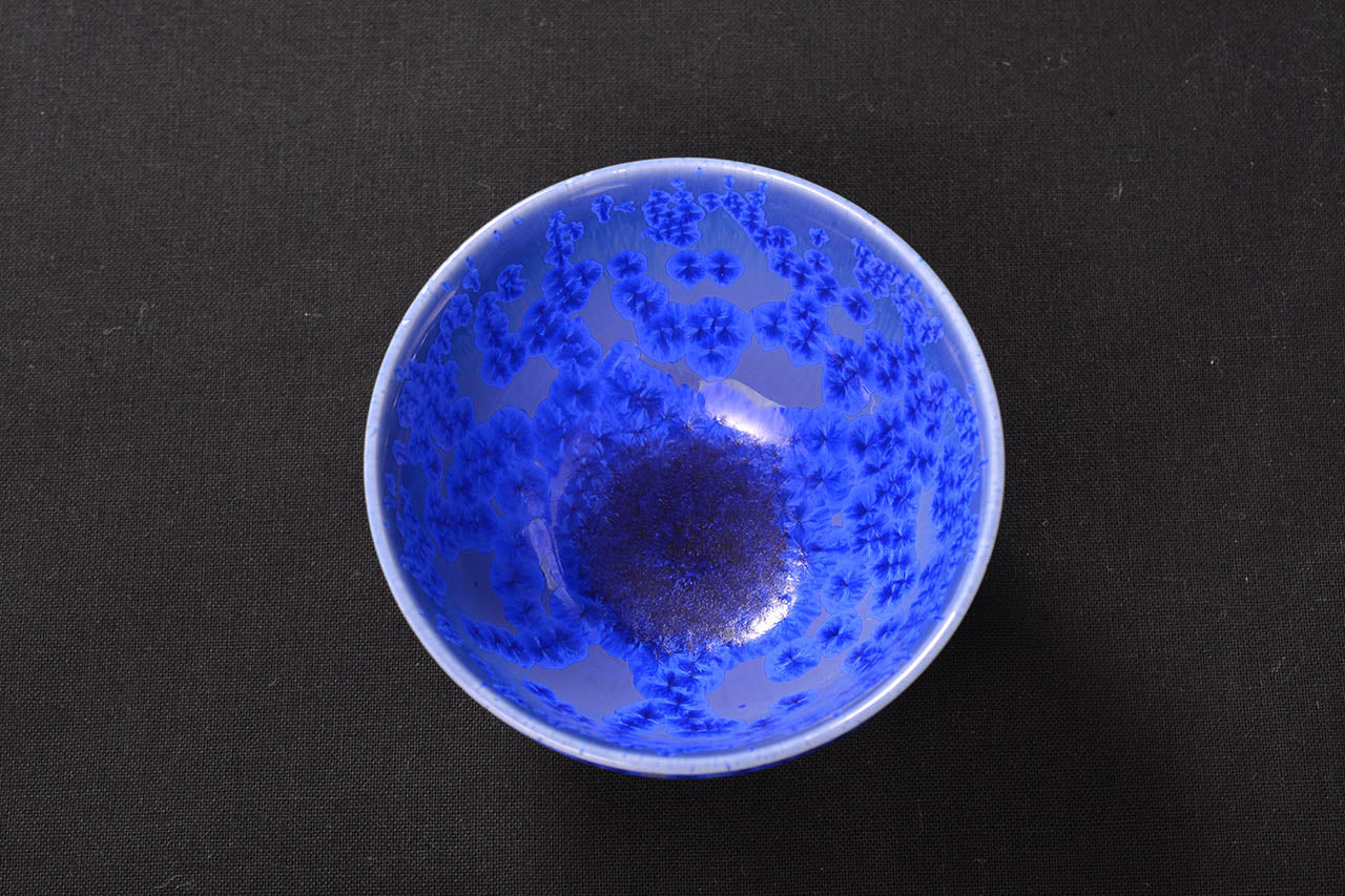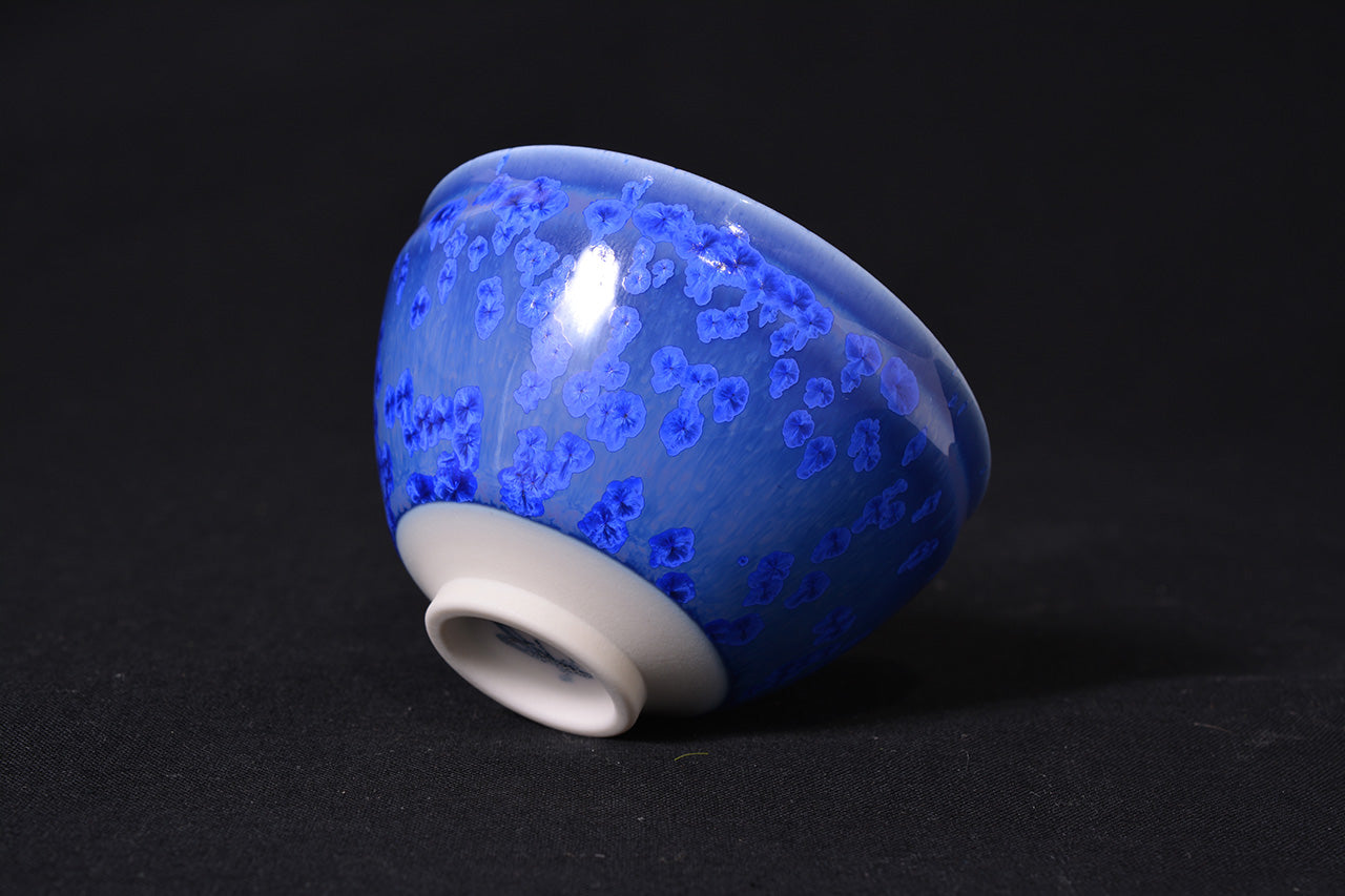 杯子整体包裹的蓝色琉璃水滴结晶釉使人联想到深邃静谧的大海的蓝色;杯中斟入茶或酒,结晶釉会闪耀出神秘的光辉,宛如宝石一般美丽。