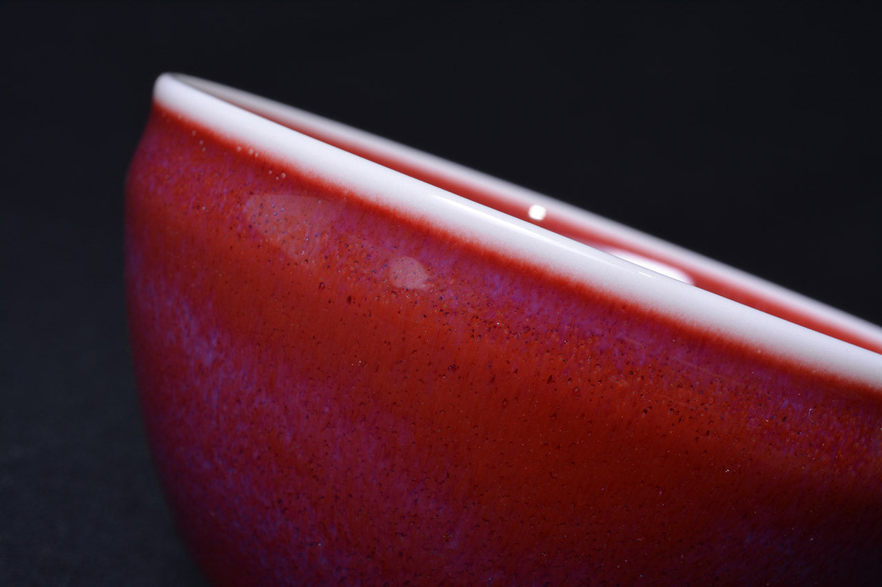 作品的红宝石色,来自于釉料中含有的铜元素的还原烧制(减少氧气量的烧制方法)。在中国明朝,这种鲜艳而庄重的颜色也被称为“宝石红”,又称霁红,主要用于宫廷仪式。此后它曾一度中断,到了清代又重新恢复。
