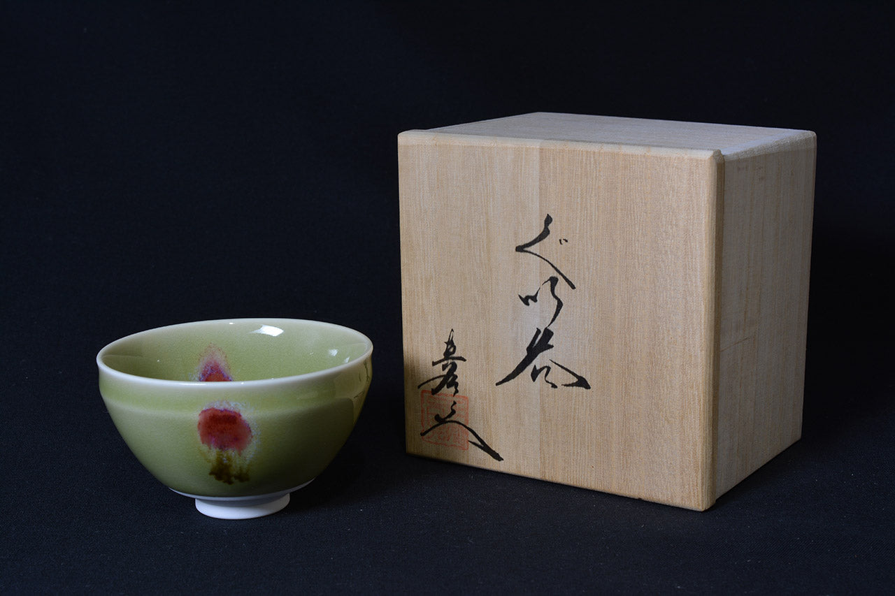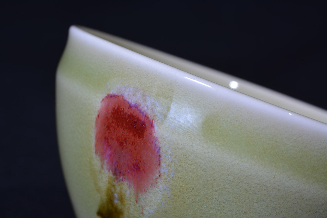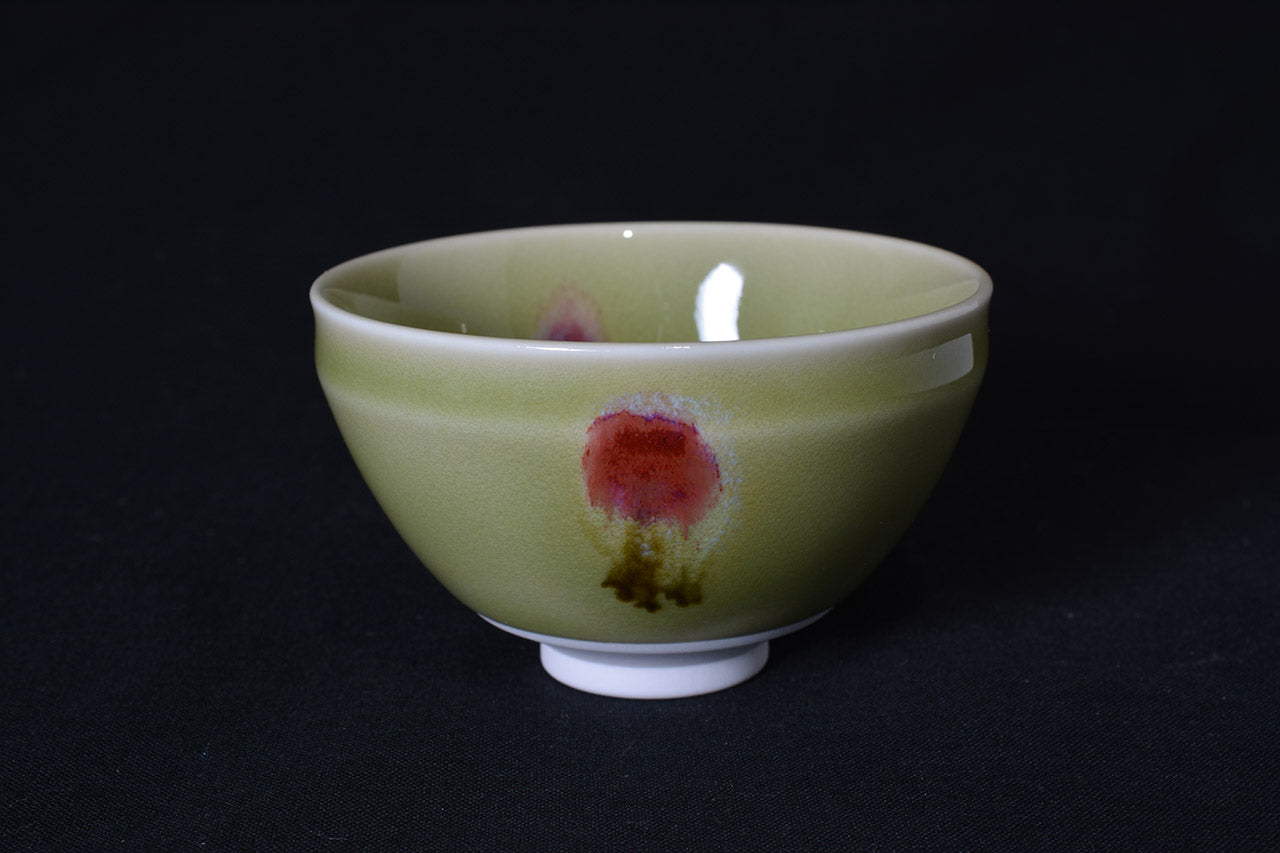 真右卫门窑将这种青瓷加以独特的调配,使绿色看起来更加深邃,并在其中点缀以真右卫门最擅长的辰砂,设计营造出草原上绽放的花朵的意象。