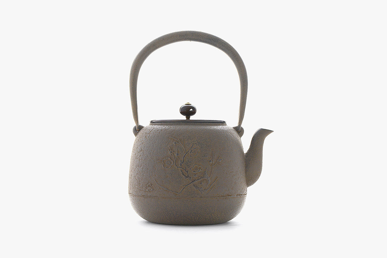这件铁壶在初代设计的枣形铁壶的基础上,装饰有一朵朵手工压制的梅花图案。铜制的壶盖和朱铜色很有特点。是一件能让人感到很有品位的作品,十分适合作为礼品。