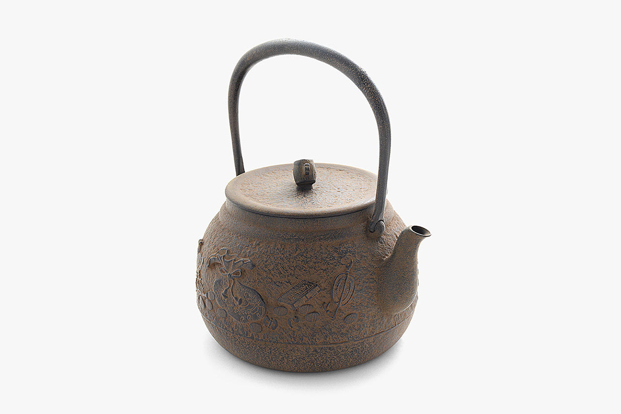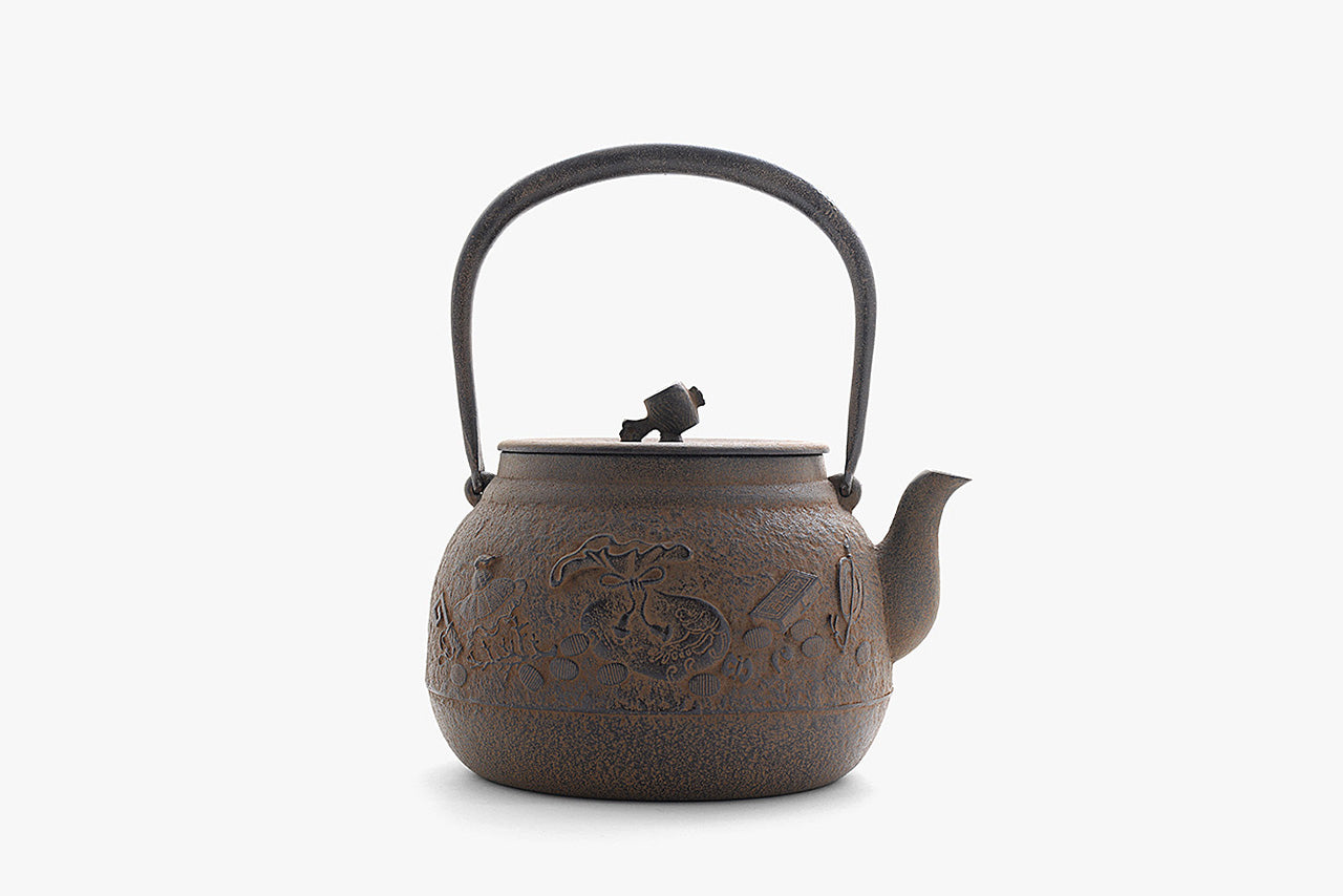 壶身上装饰着日本的多种吉祥图案的铁壶。小锤子形状的壶盖把手独具巧思,仅是观赏就很有乐趣。2.4L的容量在铁壶中属于较大的,但本工房致力于打造薄皮铸铁,因此本品与其他公司同尺寸的产品相比重量很轻。