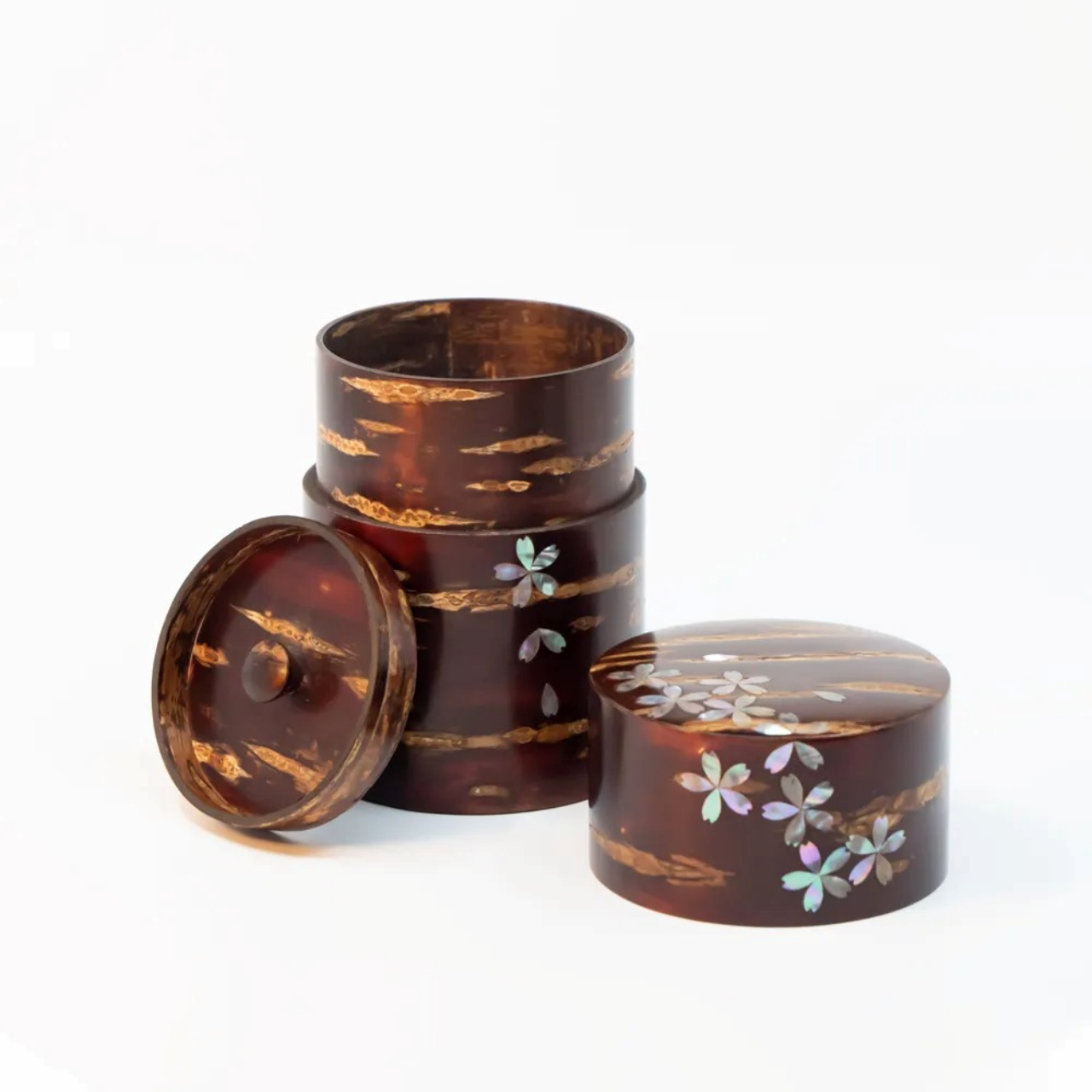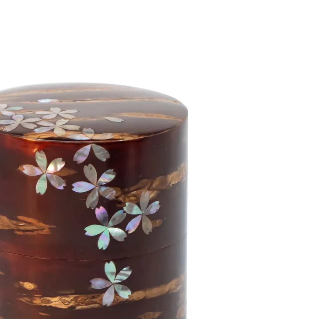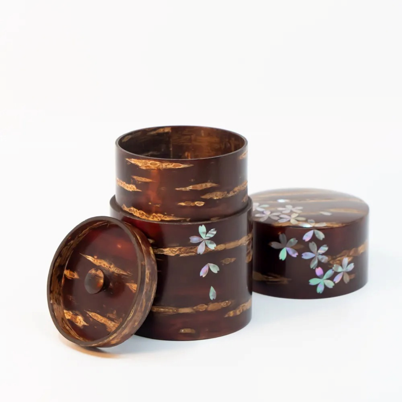 茶具 树皮茶叶罐 大 光滑樱皮 螺钿 樱吹雪 樱皮细工 木工艺品
