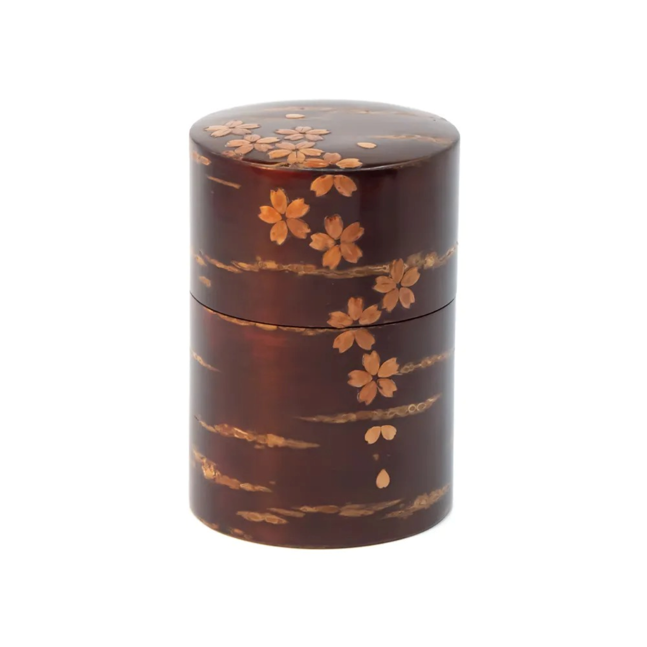 以光滑樱皮为底,并点缀以樱皮的樱花纹样的茶筒。宛如花吹雪的设计,为日常增添一抹明丽。尺寸φ7.3×11 cm,可装约100克绿茶。适合日常使用,对于初次使用樱皮细工茶筒的人来说也很合适。