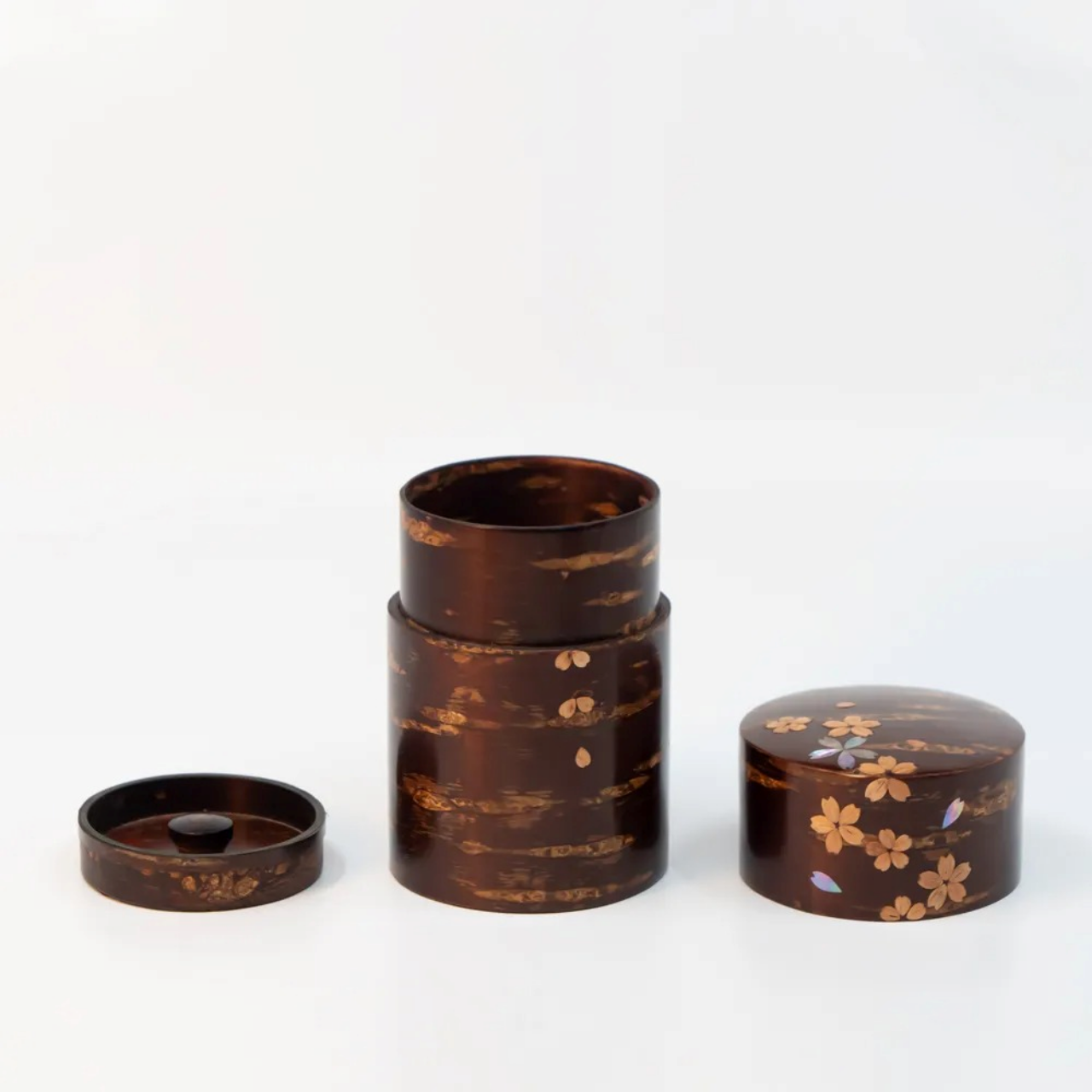 装饰有樱皮制成樱花纹样以及青贝螺钿樱花镶嵌的茶筒。木皮的沉稳色调与螺钿的光辉相映成趣,呈现出别具格调的华美之作。尺寸φ7.3×11 cm,可装约100克绿茶。无论日常使用或初次体验皆宜。