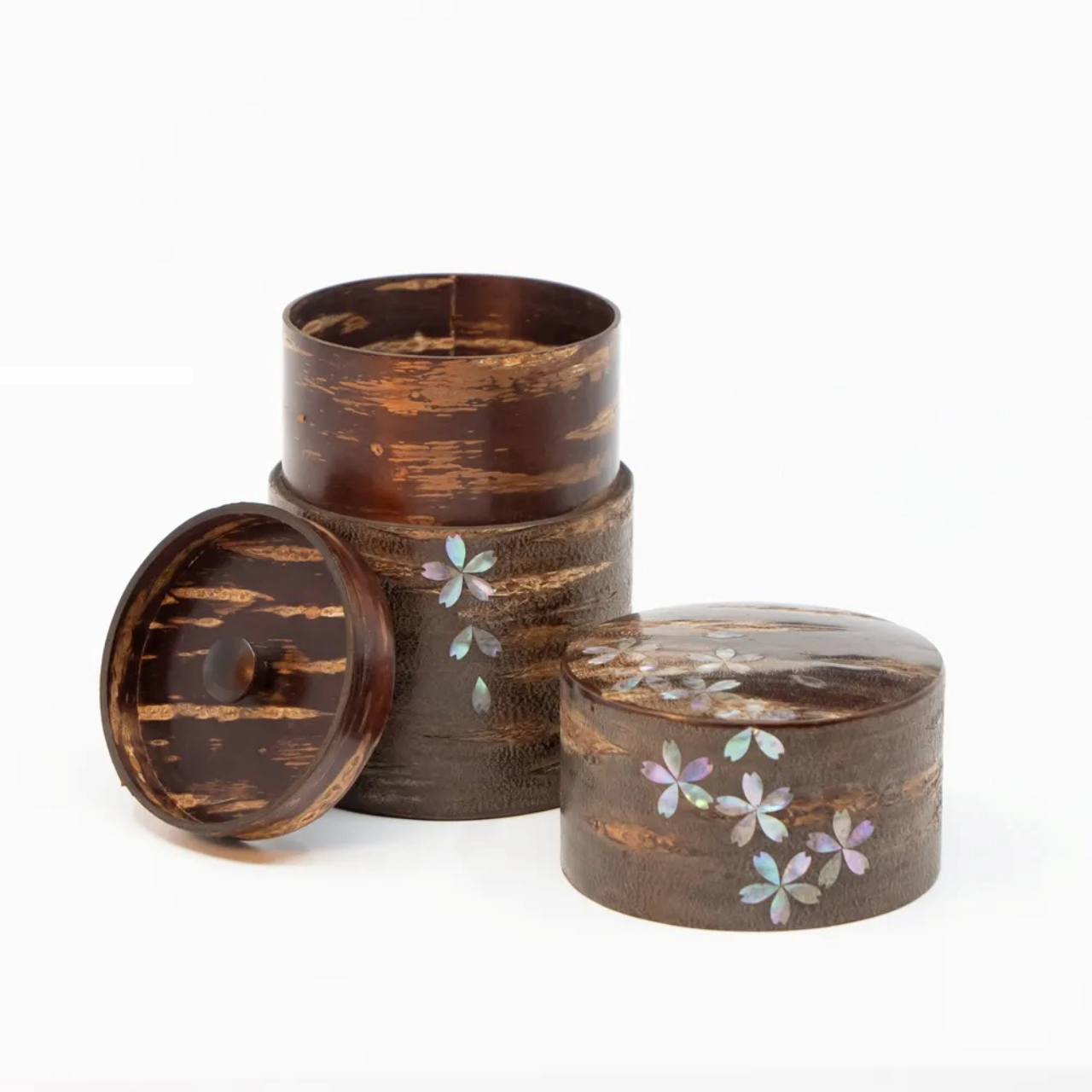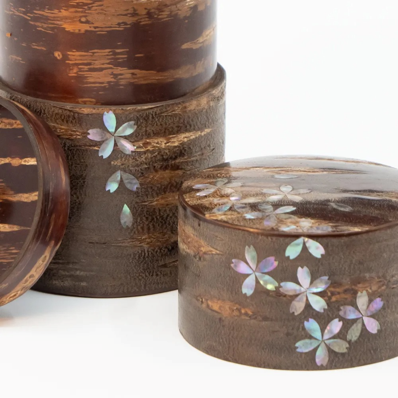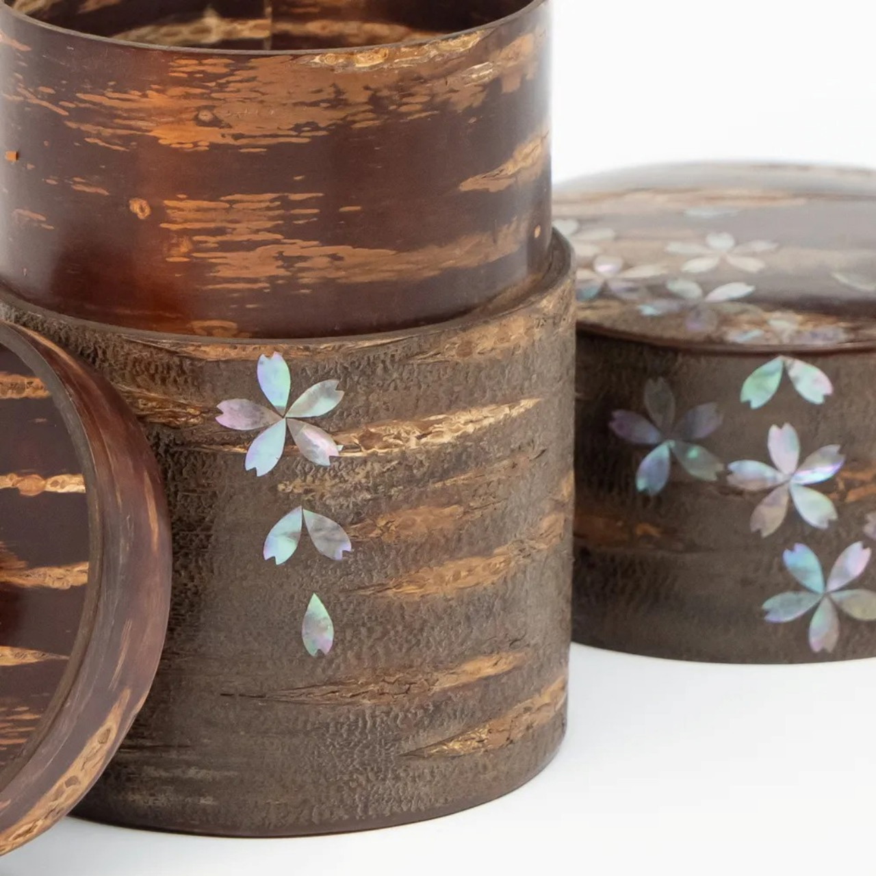 茶具 树皮茶叶罐 大 霜降樱皮 螺钿 樱吹雪 樱皮细工 木工艺品